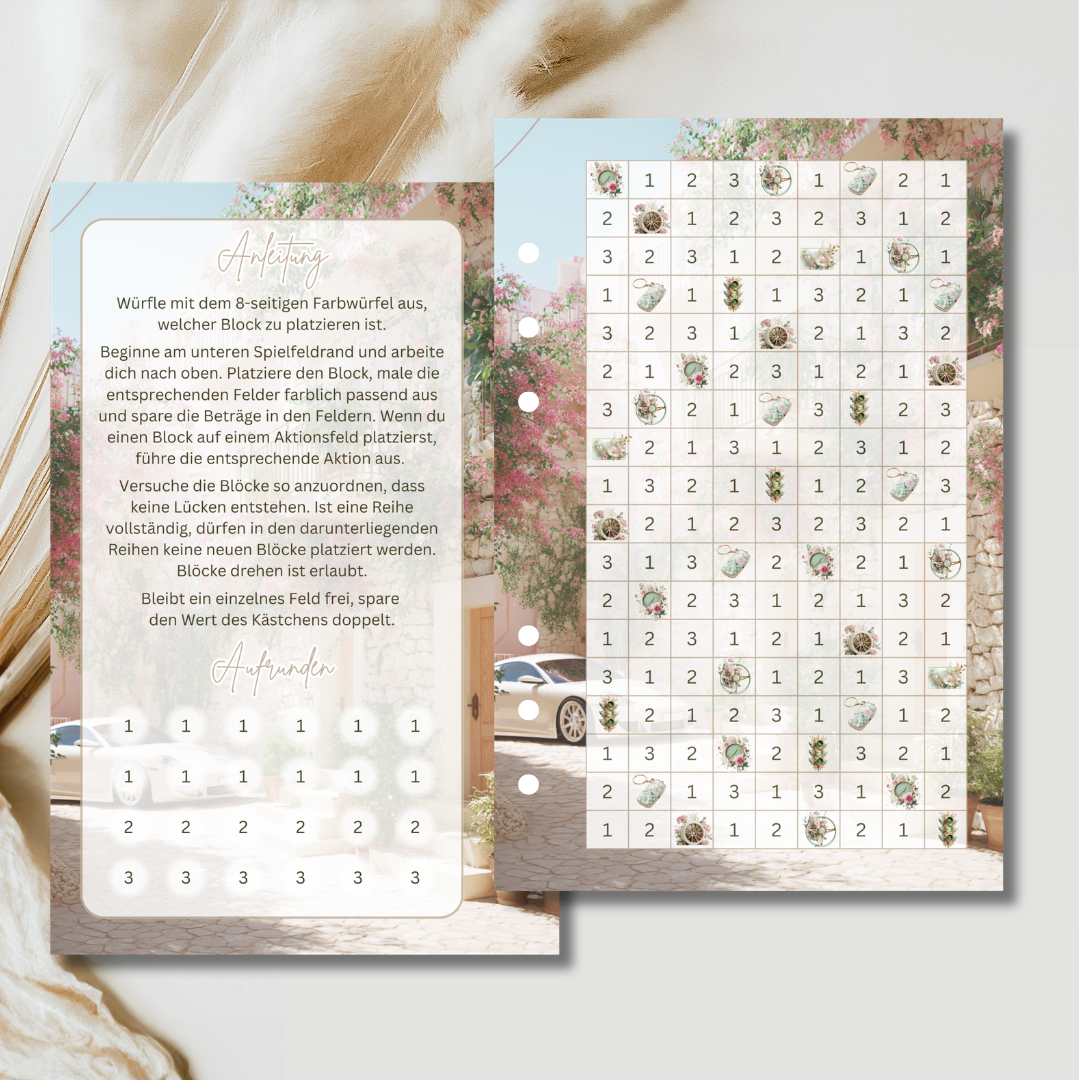 Würfle mit dem 8er-Farbwürfel aus, welchen Block du platzieren musst. Male die Felder aus und spare die Beträge, auf denen du den Block platziert hast. Landet der Block auf einem Symbol, führe die entsprechende Aktion aus.