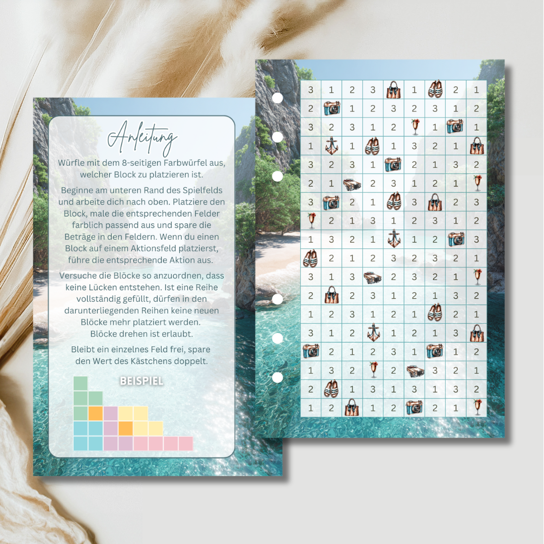 Würfle mit dem 8er-Farbwürfel aus, welchen Block du platzieren musst. Male die Felder aus und spare die Beträge, auf denen du den Block platziert hast. Landet der Block auf einem Symbol, führe die entsprechende Aktion aus.