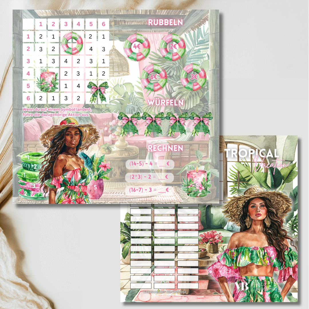 Spare mithilfe dieser 4-seitigen Klappkarte (Sparchallenge) spielerisch Geld für deinen nächsten Urlaub.